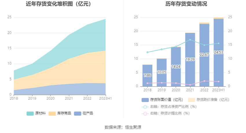 从存货变动来看,截至2023年上半年末,公司存货账面价值为24.53亿元,占净资产的15.6%,较上年末增加1.87亿元。其中,存货跌价准备为4463.53万元,计提比例为1.79%。