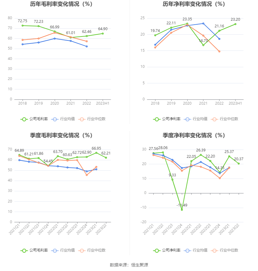 2023年上半年,公司毛利率为64.90%,同比上升2.80个百分点;净利率为23.20%,较上年同期下降1.12个百分点。从单季度指标来看,2023年第二季度公司毛利率为62.21%,同比上升1.58个百分点,环比下降4.74个百分点;净利率为20.37%,较上年同期下降6.02个百分点,较上一季度下降5.00个百分点。