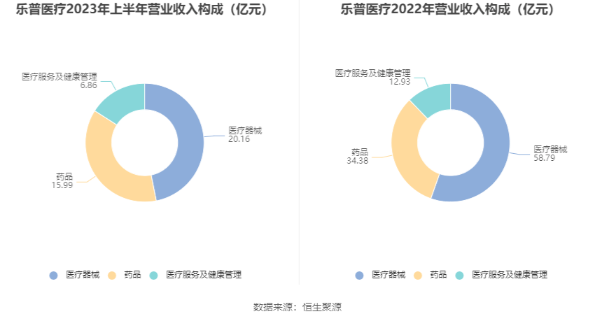 分产品来看,2023年上半年公司主营业务中,医疗器械收入20.16亿元,同比下降32.58%,占营业收入的46.87%;药品收入15.99亿元,占营业收入的37.18%;医疗服务及健康管理收入6.86亿元,同比增长15.23%,占营业收入的15.96%。