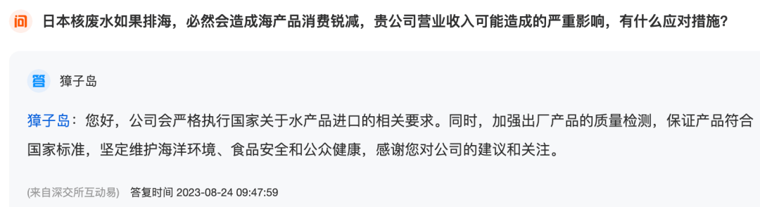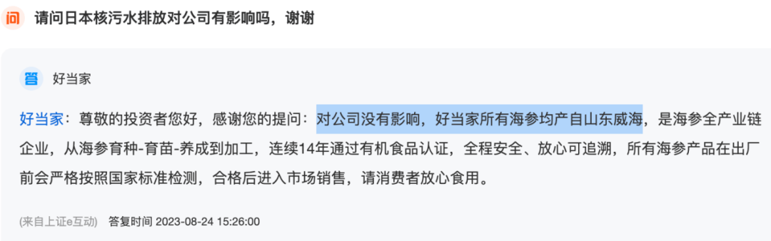 好当家被中国水产科学研究院认定为“全国最大海珍品养殖基地”,8月24日下午,其在互动平台回复投资者称:“(日本核污水排放)对公司没有影响,好当家所有海参均产自山东威海。”