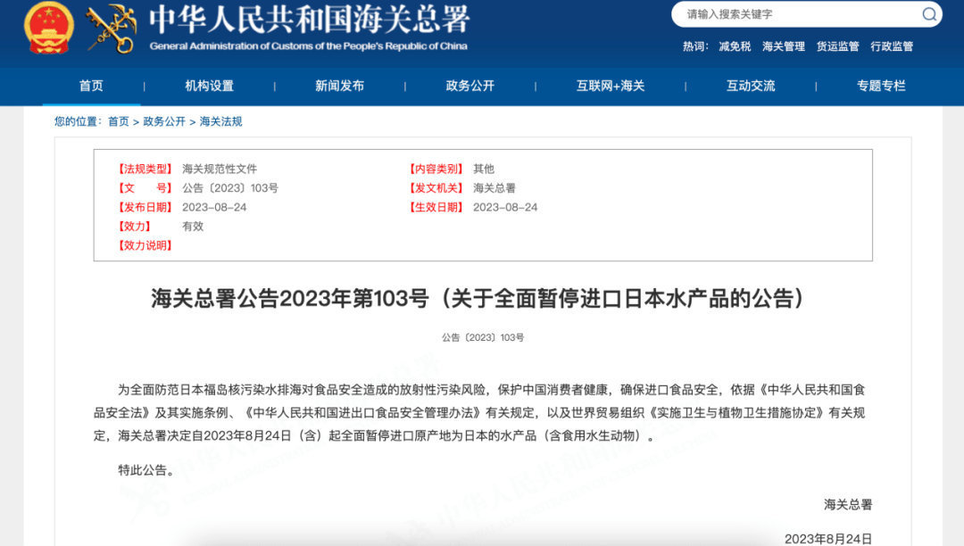 随着日本核污染水排海的正式开始,海关总署发布公告:全面暂停进口日本水产品。