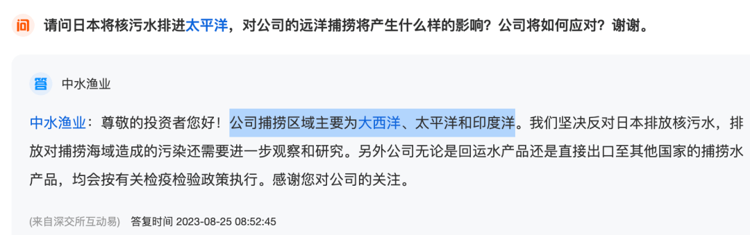 中水渔业捕捞区域主要为大西洋、太平洋和印度洋,没办法完全与太平洋撇清关系,但中水渔业表示,“坚决反对日本排放核污水,排放对捕捞海域造成的污染还需要进一步观察和研究。另外公司无论是回运水产品还是直接出口至其他国家的捕捞水产品,均会按有关检疫检验政策执行。”