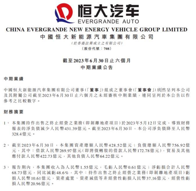 在恒大发布申请复牌公告的同时,旗下电动汽车公司恒大汽车也公布了2023年上半年业绩,收入1.55亿元,净亏损68.73亿元且同比减亏48.6%,其中属于汽车业务的经营性亏损为20.9亿元。截至6月30日的净负债降至328.4亿元,报告期内降债431亿元主要归功于完成地产业务剥离。
