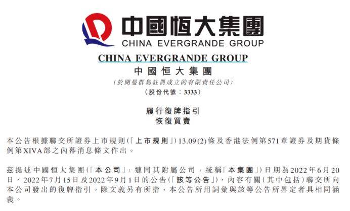 8月25日北京时间周五晚,中国恒大发布公告称已完成各项复牌指引,已向香港联交所申请于8月28日(即下周一)上午9点起正式复牌。