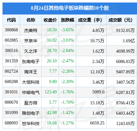 8月24日其他电子板块较上一交易日上涨0.25%,香农芯创领涨。当日上证指数报收于3082.24,上涨0.12%。深证成指报收于10256.19,上涨1.02%。其他电子板块个股涨跌见下表: