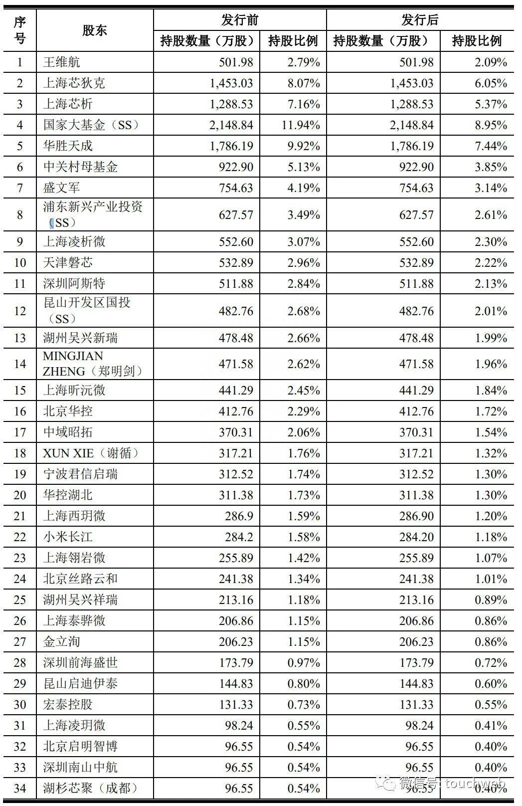 IPO前,国家大基金(SS)持股为11.94%,华胜天成持股为9.92%,中关村母基金持股为5.13%,浦东新兴产业投资(SS)持股为3.49%,昆山开发区国投(SS)持股为2.68%,小米长江持股为1.58%。