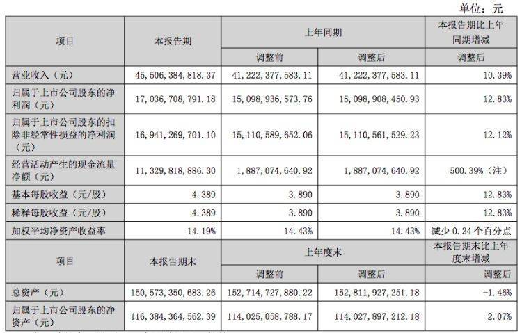 五粮液8月25日晚发布2023年半年度报告,上半年实现营业收入455.06亿元,同比增长10.39%;归母净利润170.37亿元,同比增长12.83%;基本每股收益4.389元。