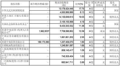 3.含社保基金会国有资本划转六户持有的1,970,269,383股本行A股股份。除上表列示的持股情况外,社保基金会还持有本行H股637,338,000股,系通过管理人间接持有(含港股通)。报告期末,社保基金会持有本行A股和H股共计12,175,826,900股,占本行已发行普通股股份总数的16.40%。