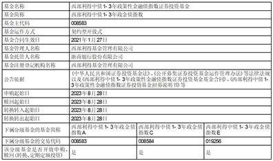 根据《中华人民共和国证券投资基金法》、《公开募集证券投资基金运作管理办法》、《公开募集证券投资基金销售机构监督管理办法》、《公开募集证券投资基金信息披露管理办法》(以下简称“《信息披露办法》”)等相关法律法规的规定及《西部利得中债1-3年政策性金融债指数证券投资基金基金合同》(以下简称“基金合同”)的约定,为更好地满足广大投资者的投资要求,西部利得基金管理有限公司(以下简称“本公司”)与基金托管人浙商银行股份有限公司(以下简称“基金托管人”)协商一致,决定于2023年8月28日起增加西部利得中债1-3年政策性金融债指数证券投资基金(以下简称“本基金”)的E类份额(E类份额代码:019256),并修改基金合同、托管协议,同时更新基金管理人、基金托管人的基本信息。现将具体事项公告如下: