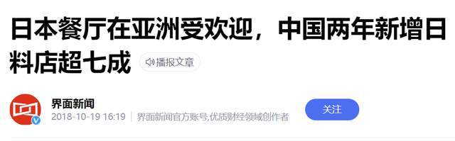 讲一个公开的新闻,2018年10月19日 《界面新闻》的报道:中国内地是亚洲市场上日本餐厅数量增长最快的,从2015年的约2.3万家增至2017年的4万多家,增长超过7成。