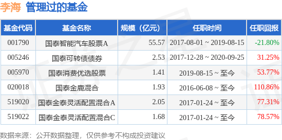 李海先生:中国,硕士研究生。2005年7月至2007年3月在中国银行中山分行工作。2008年9月至2011年7月在中国人民大学学习。2011年7月加入国泰基金管理有限公司,历任研究员和基金经理助理。2016年6月至2019年1月任国泰金鹿保本增值混合证券投资基金的基金经理,2017年1月起兼任国泰金泰灵活配置混合型证券投资基金(由国泰金泰平衡混合型证券投资基金变更注册而来)的基金经理,2017年8月至2019年8月任国泰智能汽车股票型证券投资基金的基金经理,2017年12月起兼任国泰可转债债券型证券投资基金的基金经理,2019年1月起兼任国泰金鹿混合型证券投资基金(由国泰金鹿保本增值混合证券投资基金转型而来)的基金经理。