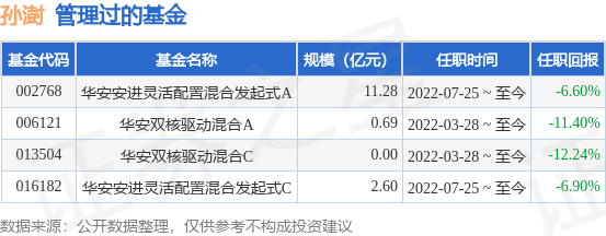 孙澍先生:中国国籍,硕士研究生,曾任Alex&Forrest,Inc研究部数量研究员、芝加哥期权交易所权益研究部数量研究员、平安资产管理有限责任公司量化交易研究员、工银瑞信基金管理有限公司权益投资部投资经理,2021年9月加入华安基金,现任基金投资部基金经理。2022年3月28日任华安双核驱动混合型证券投资基金基金经理。现任华安安进灵活配置混合型发起式证券投资基金基金经理。