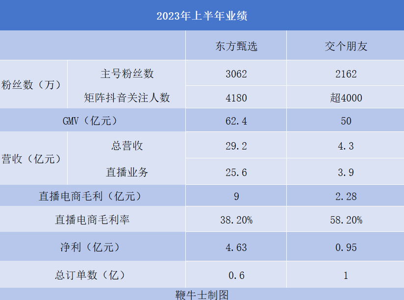 带货成绩上,2023年上半年交个朋友控股全网合计完成的商品交易总额(GMV)超过50亿元;东方甄选前五个月就达到了52亿,已经略超交个朋友。另外交个朋友的粉丝数也要低于东方甄选。总订单数上,截至2023年7月,交个朋友累计订单总量超过1亿,要远高于东方甄选。业绩方面,东方甄选和交个朋友都实现了扭亏为盈。但东方甄选在营收和净利上要远高于交个朋友。财报显示,东方甄选2023财年,持续经营业务的净营收同比增加651.0%至45亿元;持续经营业务净利润为9.713亿元,上财年净亏损为7100万元,实现扭亏为盈。2023财年,东方甄选自营产品及直播电商分部总营收为人民币39亿元,其中自营产品的总营收超过26亿元。经过换算后,2023上半年东方甄选直播电商营收为25.6亿元,半年净利润约为4.63亿元。再看交个朋友,上半年收入约为4.33亿元,较2022年同期(约1.37亿元)增长215.5%;经调整净利润约9463.5万元,同比大增1798%。对于收入和利润的大增,交个朋友控股在财报中表示,中期期间,得益于抖音、淘宝和京东三平台的跨平台运营,新媒体服务业务板块收入大幅增加,从去年同期的5290万元增加至今年中期的3.92亿元,大增约640.7%。东方甄选在财报中指出,目前来自抖音的GMV占其GMV的绝大部分,但东方甄选同样将多渠道、多平台发展策略作为接下来的重点。2023年7月初,东方甄选App全新上线,8月29日东方甄选还将启动淘宝直播。毛利和毛利率上,东方甄选称由于自营产品及直播电商业务大幅增长所致,其总营收成本总额从2022财年的人民币209.7百万元增加 1,118.6%至2023财年的人民币26亿元。毛利从2022财年的人民币390.9百万元增加400.1%至2023财年的人民币20亿元。毛利率由2022财年的65.1%减少至2023 财年的43.3%,主要由于自营产品及直播电商业务迅速发展所致。2023财年,东方甄选自营产品及直播电商的分部毛利为人民币15亿元,毛利率从2022财年的 37.8%增加至2023财年的38.2%交个朋友财报显示,公司整体毛利率从去年同期的40.0%大幅度攀升至56.5%,其中新媒体服务的毛利润为2.28亿元,毛利达到58.2%。从成本和支出来看,2023年上半年交个朋友控股的销售成本为1.88亿元,同比增长128.9%;销售开支为1.08亿元,较上年同期的2630万元增加8140万元;行政开支为8840万元,较上年同期的4910万元增加了3930万元。在销售产品上,和交个朋友不同的是,东方甄选的自营产品逐渐成为营收增长的一大动力。据了解,自2022年4月上线首款自营产品以来,东方甄选产品品类从生鲜食品拓展至果汁、咖啡、茶、床上用品等,目前已开发超过120款自营产品,2023财年,东方甄选自营产品的总营收超过26亿元,占总营收的四分之一。在接下来的发展过程中,东方甄选除了坚持「多渠道策略」外,推广会员体系,未来推出会员卡也将成为接下来的重点。而交个朋友则会继续坚持跨平台运营。在此前媒体的采访中,接近交个朋友的相关人士表示,除了现在的抖音、淘宝、京东外,未来不排除还会进入其他平台。除此之外,交个朋友和东方甄选同时都在寻找新的增长故事。比如今年,东方甄选宣布开始进军文旅产业,面向中老年人,提供有文化幸福感、有知识获得感、有个人追求感的高品质文旅服务。交个朋友则是围绕直播电商业务,进行全产业链的业务布局,目前已经衍生出MCN服务、自有品牌孵化、供应链SaaS服务、新媒体整合营销、品牌代运营、直播培训学校、海外电商等多个业务板块,形成商业闭环,为行业进行全周期服务。结论:并蒂莲花开抖音