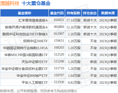 根据2023Q1季报公募基金重仓股数据,重仓该股的公募基金共15家,其中持有数量最多的公募基金为汇丰晋信慧嘉债券A。汇丰晋信慧嘉债券A目前规模为2.49亿元,最新净值0.9986(5月25日),较上一交易日上涨0.04%。该公募基金现任基金经理为蔡若林 范坤祥。蔡若林在任的基金产品包括:汇丰晋信2016周期混合,管理时间为2016年1月30日至今,期间收益率为27.61%;汇丰晋信平稳增利中短债A,管理时间为2019年7月27日至今,期间收益率为11.36%;汇丰晋信惠安纯债63个月定开债,管理时间为2020年10月29日至今,期间收益率为9.68%;汇丰晋信慧悦混合,管理时间为2022年3月3日至今,期间收益率为0.89%。范坤祥在任的基金产品包括:汇丰晋信消费红利股票,管理时间为2021年3月13日至今,期间收益率为-25.98%;汇丰晋信慧盈混合,管理时间为2022年4月29日至今,期间收益率为-1.08%;