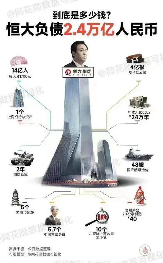 恒大的窟窿实在太大了,2.44万亿的总负债,接近甘肃、海南、宁夏、青海、西藏加在一起的GDP之和。人家当了6年房企老大的碧桂园,总负债也才1.44万亿,比恒大足足少了1万亿。