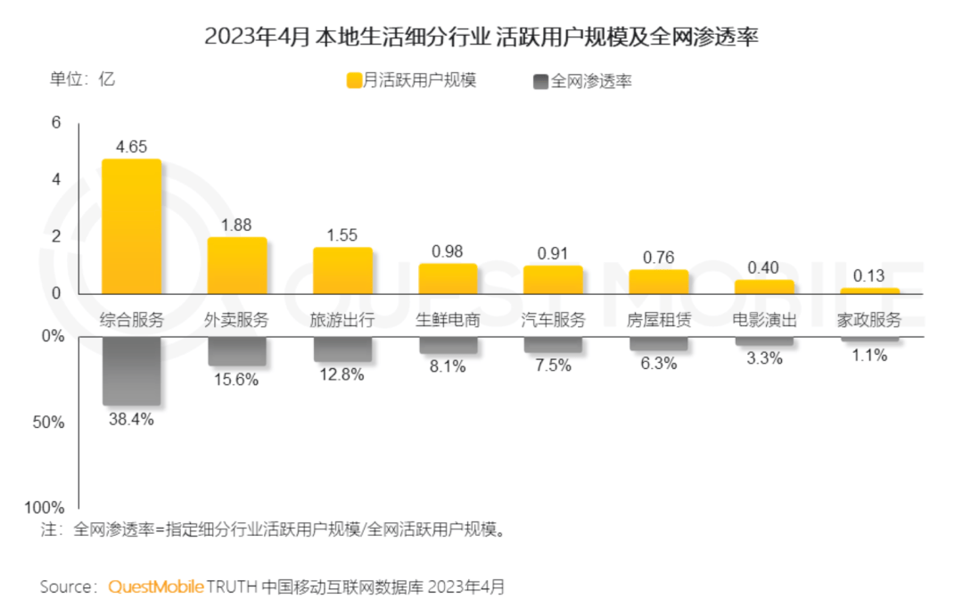 第三方数据机构艾瑞咨询统计,2022年中国本地生活服务市场规模达到3.8万亿元,同比增长23.5%。据QuestMobile,2023年4月,本地生活综合服务行业全网渗透率38.4%,外卖服务渗透率15.6%,这意味着本地生活仍有较大的增长空间。