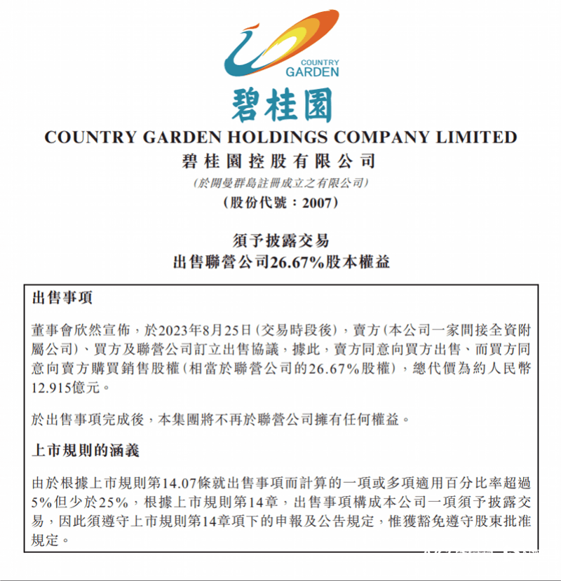根据出售协议,碧桂园出售联营公司销售股权(相当于联营公司的26.67%股权)及相关实质权益(包括但不限卖方应享有的联营公司截至2023年6月30日的权益未分配利润及权益盈余公积合计约人民币2.377亿元,及联营公司自2023年6月30日至完成日基于销售股权的任何盈利或亏损)。