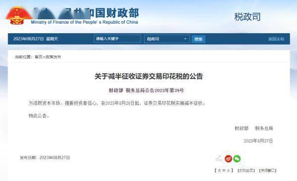为活跃资本市场、提振投资者信心,自2023年8月28日起,证券交易印花税实施减半征收。