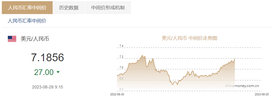 金融界8月28日消息 中国外汇交易中心显示,28日,人民币兑美元中间价报7.1856,调升27个基点。8月25日,在岸人民币兑美元官方收报7.2884,较上一交易日官方收盘价跌107点,较上日夜盘收盘跌94点。