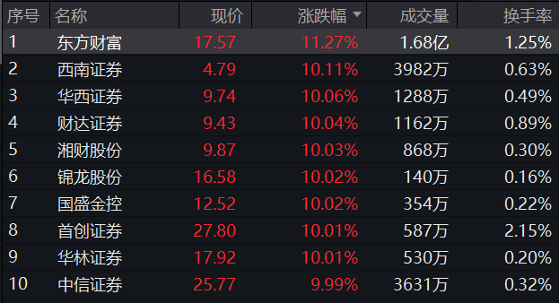 证券ETF华安(516200)紧密跟踪中证全指证券公司指数。指数成份股中,东方财富上涨11.27%,西南证券、华西证券、财达证券、湘菜证券等多股涨停。
