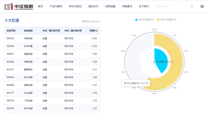 数据显示,截至2023年8月25日,该指数前十大权重股包括中信证券、东方财富、海通证券、华泰证券、国泰君安等,前十大之和为56.12%。(数据来源:中证指数公司,指数成份股不代表个股推荐)