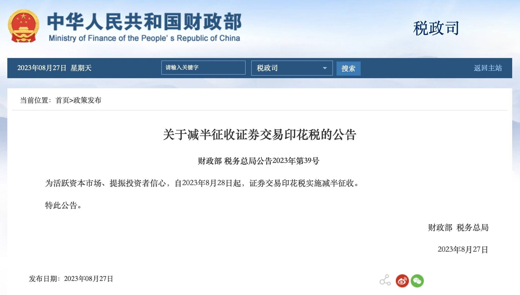 8月27日,财政部网站公告:为活跃资本市场、提振投资者信心,自2023年8月28日起,证券交易印花税实施减半征收。