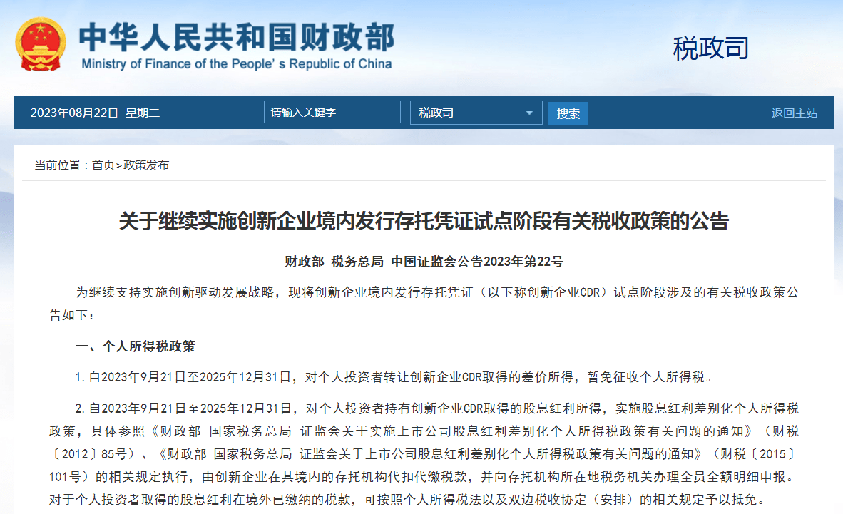 8月22日,财政部、税务总局、中国证监会发布关于继续实施创新企业境内发行存托凭证试点阶段有关税收政策的公告,涉及个人所得税政策、企业所得税政策、增值税政策、印花税政策四方面有关税收政策,在印花税政策方面,提出在上海证券交易所、深圳证券交易所转让创新企业CDR,按照实际成交金额,由出让方按1‰的税率缴纳证券交易印花税。