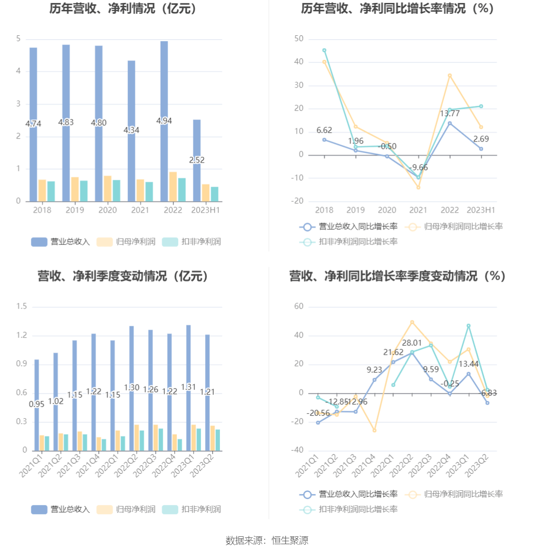 根据半年报,公司第二季度实现营业总收入1.21亿元,同比下降6.83%,环比下降7.35%;归母净利润2646.86万元,同比下降1.97%,环比下降1.56%;扣非净利润2182.56万元,同比增长2.32%,环比下降4.05%。