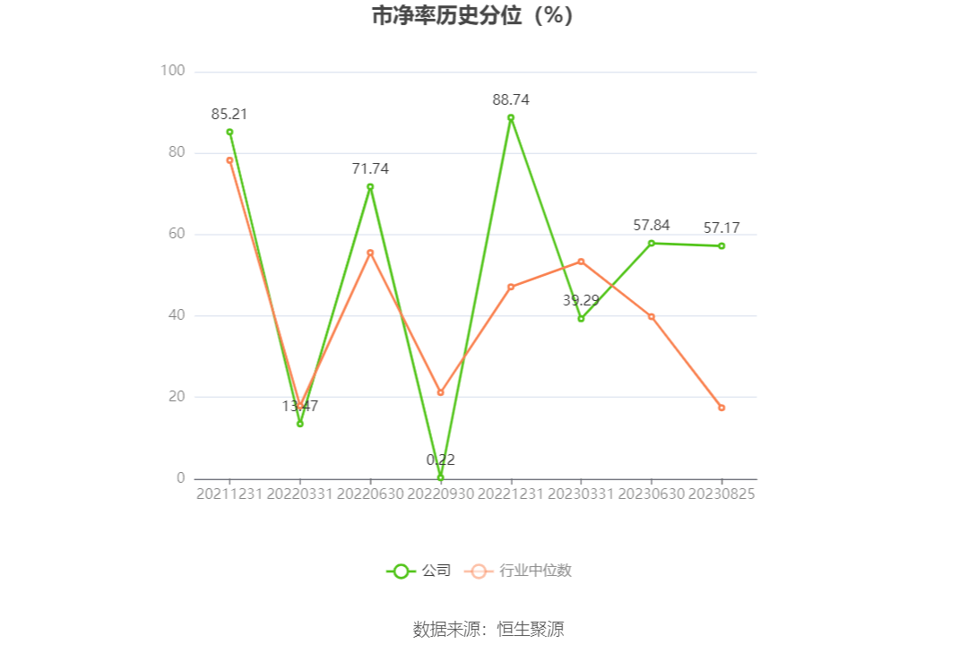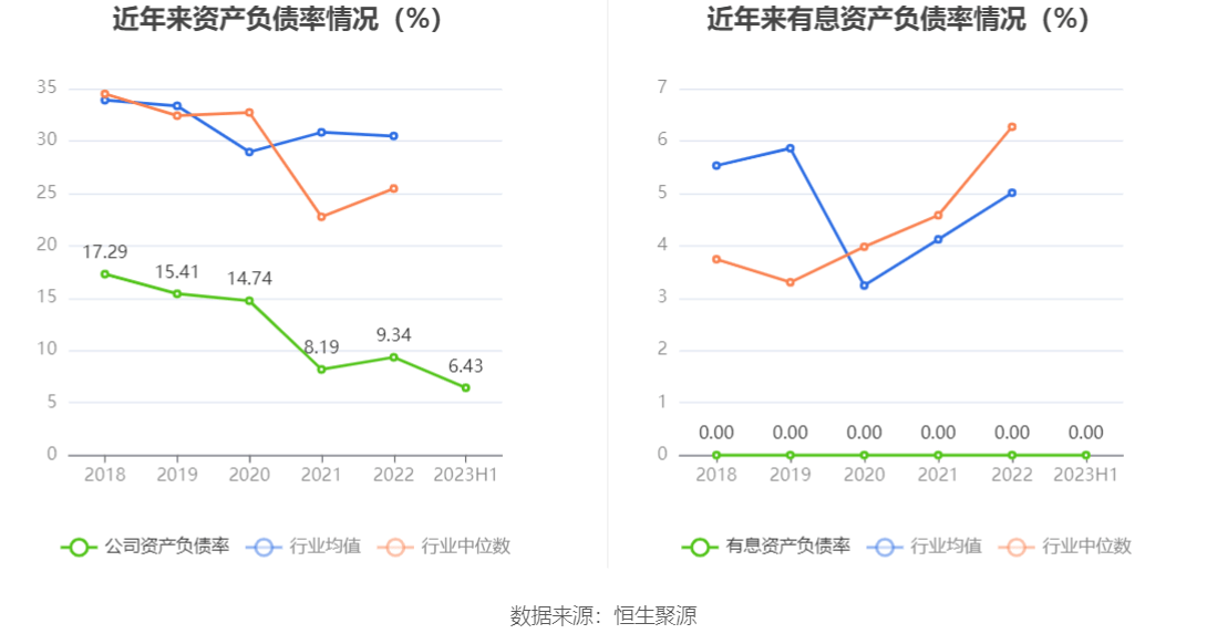 偿债能力方面,公司2023年二季度末资产负债率为6.43%,相比上年末减少2.91个百分点;有息资产负债率为0.00%,相比上年末持平。