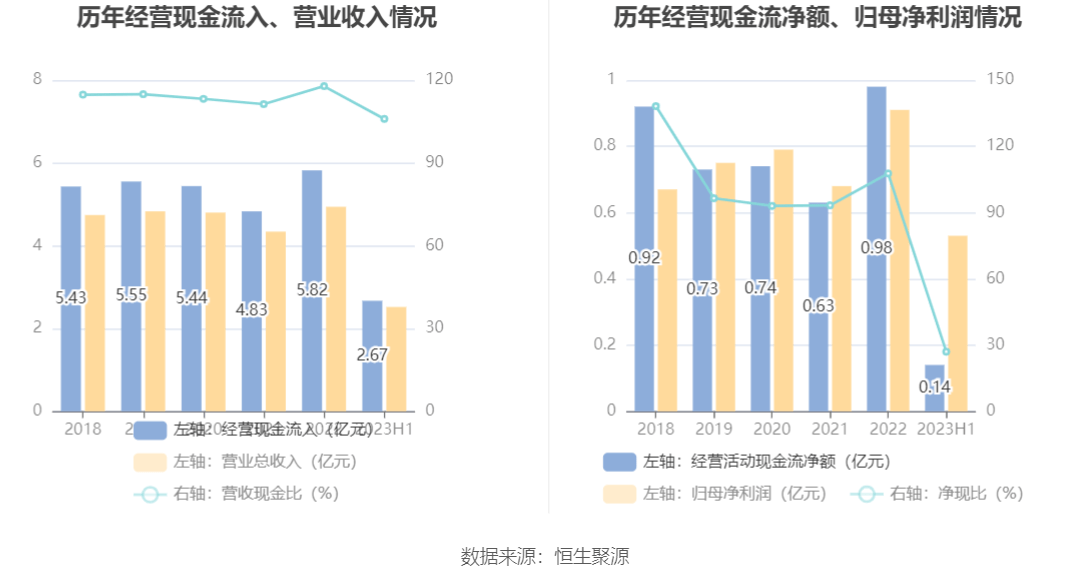 2023年上半年,公司营业收入现金比为105.95%,净现比为27.03%。
