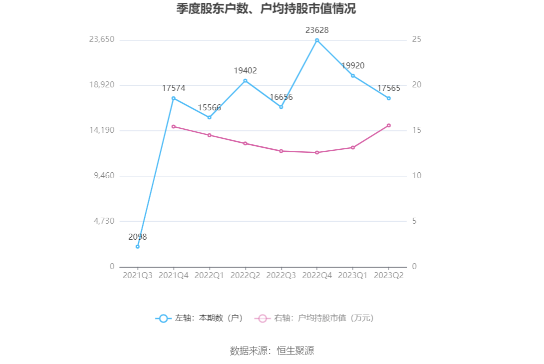 筹码集中度方面,截至2023年二季度末,公司股东总户数为1.76万户,较一季度末下降了2355户,降幅11.82%;户均持股市值由一季度末的13.14万元上升至15.58万元,增幅为18.57%。