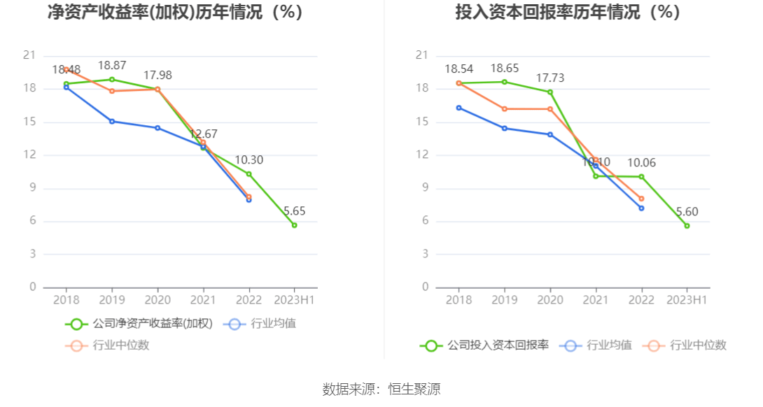 数据显示,2023年上半年公司加权平均净资产收益率为5.65%,较上年同期增长0.22个百分点;公司2023年上半年投入资本回报率为5.60%,较上年同期增长0.21个百分点。