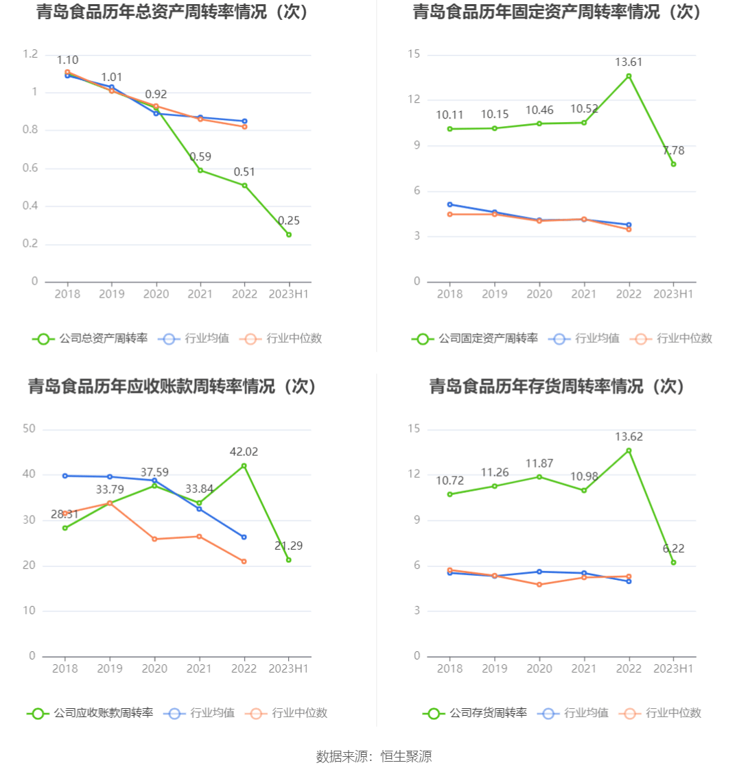 营运能力方面,2023年上半年,公司总资产周转率为0.25次,上年同期为0.26次(2022年上半年行业平均值为0.40次,公司位居同行业18/21);固定资产周转率为7.78次,上年同期为6.57次(2022年上半年行业平均值为1.84次,公司位居同行业3/21);公司应收账款周转率、存货周转率分别为21.29次、6.22次。