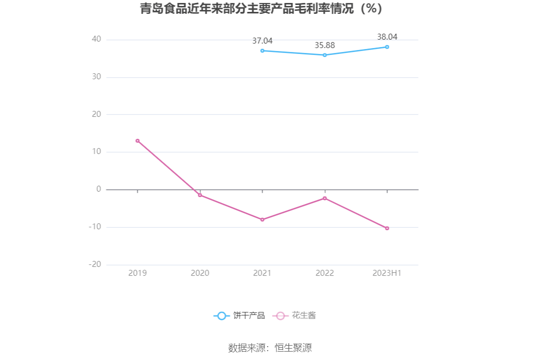 分产品看,饼干产品、花生酱2023年上半年毛利率分别为38.04%、-10.31%。
