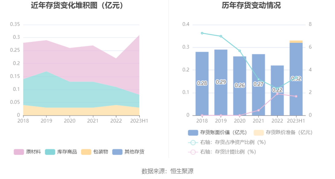 从存货变动来看,截至2023年上半年末,公司存货账面价值为3149.72万元,占净资产的3.34%,较上年末增加950.49万元。其中,存货跌价准备为53.91万元,计提比例为1.68%。