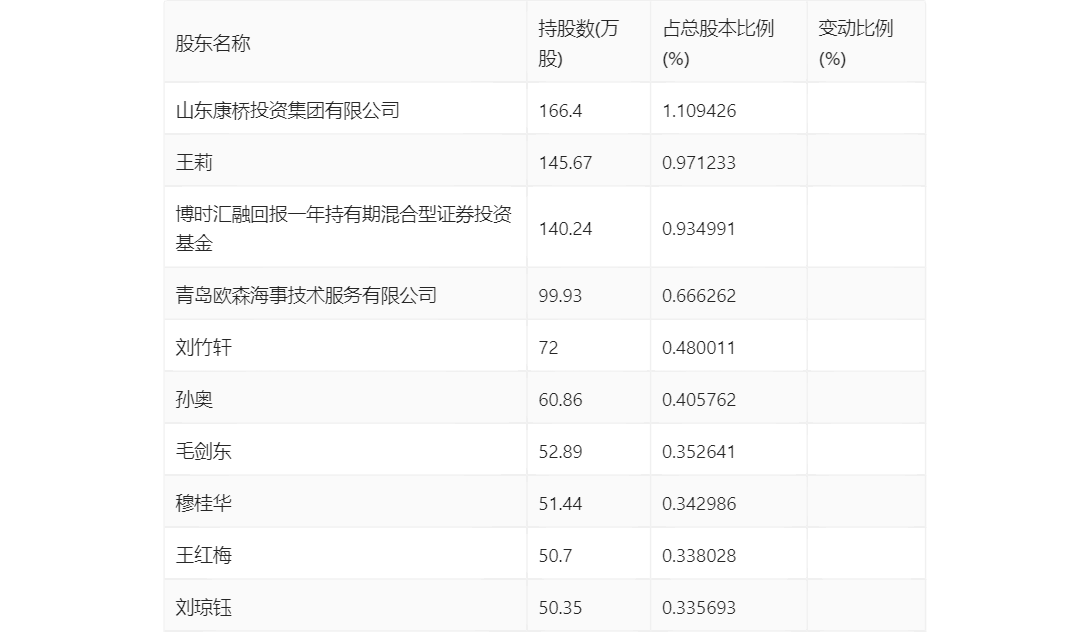 半年报显示,2023年上半年末的公司十大流通股东中,新进股东为博时汇融回报一年持有期混合型证券投资基金,取代了一季度末的周云龙。在具体持股比例上,青岛欧森海事技术服务有限公司持股有所下降。