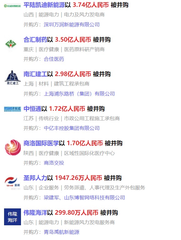 本周国内披露已完成的并购事件8个,与上周相比减少13个,分布在医疗健康、传统行业、能源电力行业。其中,深圳万润新能源有限公司以3.74亿人民币收购电力及风力发电商平陆凯迪新能源100%股份。被收购方公司成立于2006年,位于山西省运城市,专注于电力业务、风力发电。