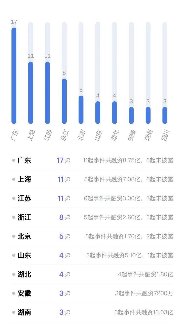 从本周披露获投企业的地区分布来看,主要集中在广东、上海、江苏。其中广东披露17个,上海披露11个,江苏披露11个。
