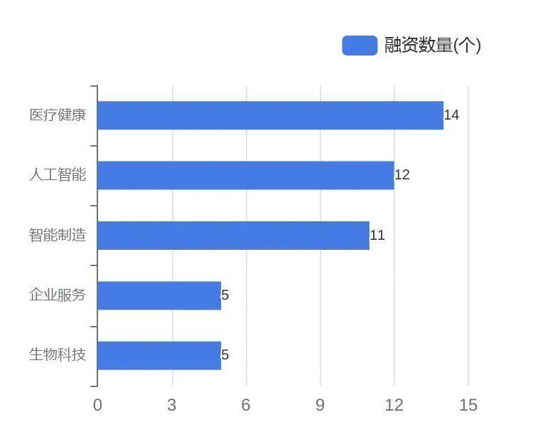 从融资事件数量来看,本周医疗健康、人工智能、智能制造领域融资最活跃。分别为医疗健康14个、人工智能12个、智能制造11个。
