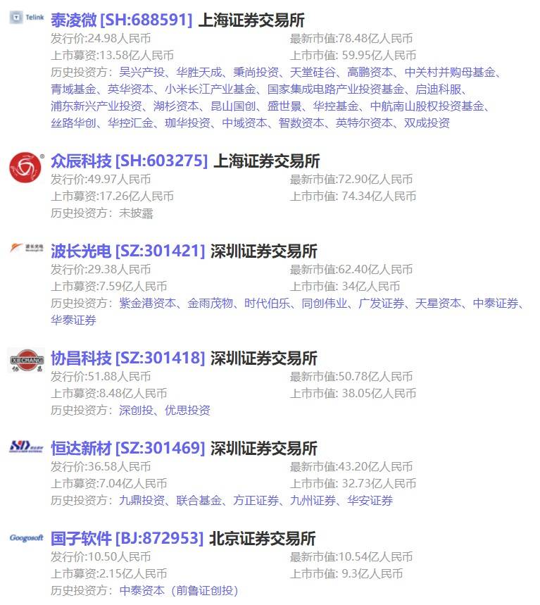 6家上市公司中,有5家曾获VC/PE或CVC投资,其中「泰凌微」曾获天堂硅谷、小米长江产业基金、盛世景投资;「波长光电」曾获同创伟业、华泰证券、天星资本投资;「国子软件」曾获中泰资本(前鲁证创投)投资。