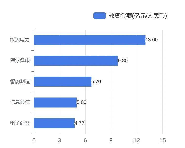 从已披露金额事件的融资规模来看,能源电力最高,融资总规模约为13.00亿元人民币。其中光伏装备制造商 「红太阳光电」 获10.00亿人民币 A轮融资。