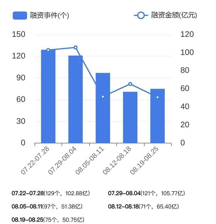 根据睿兽分析监测数据,本周国内一级市场披露的融资事件75个,与上周相比增加4个,其中已披露融资金额的事件49个,总融资规模为50.75亿元人民币,平均融资金额为1.04亿元人民币。