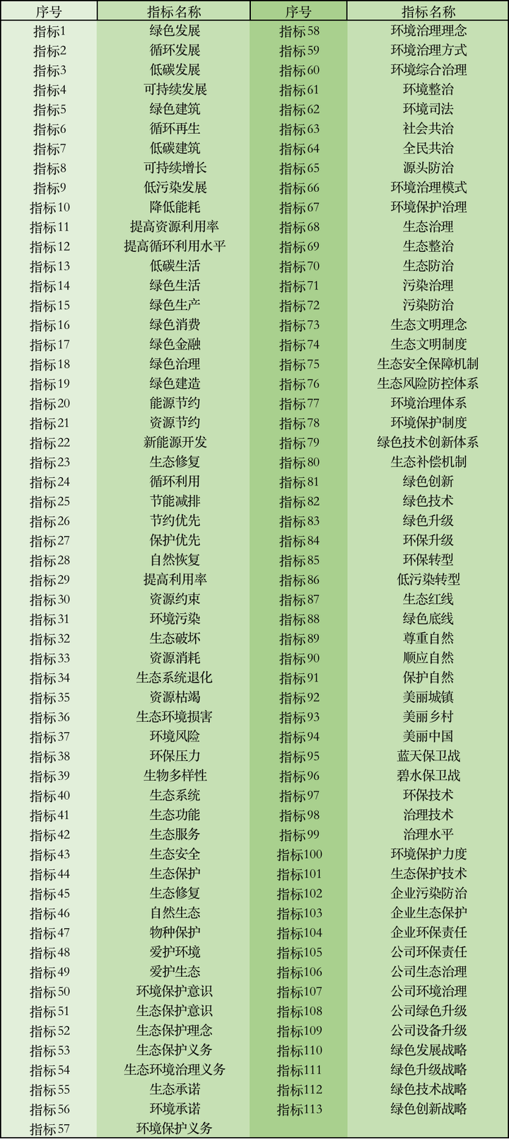 第一,从宣传倡议 (Grep)、 战略理念 (Grec)、技术创新(Grei)、排污治理 (Gree) 和监测管理 (Grem)5 个分项指标选取 113 个企业绿色化转型关键词。
