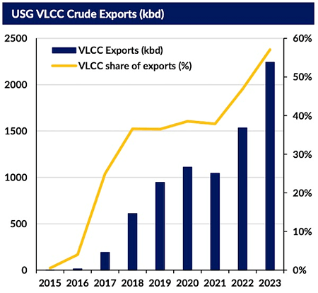 船舶经纪公司Gibson在其最新周报中表示,近年来美国原油产量显著增加,以往大多数美国出口原油由阿芙拉型和苏伊士型油轮运载,如今有更多的VLCC被部署到美湾出口航线上。