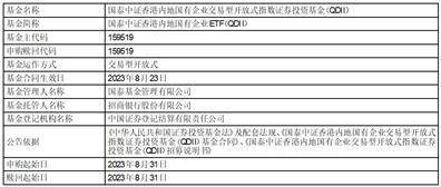 国泰中证香港内地国有企业交易型开放式指数证券投资基金(QDII)将于2023年8月31日在深圳证券交易所上市,上市交易公告书全文于2023年8月28日在本公司网站(www.gtfund.com)和中国证监会基金电子披露网站(http://eid.csrc.gov.cn/fund)披露,供投资者查阅。如有疑问可拨打本公司客服电话(400-888-8688)咨询。