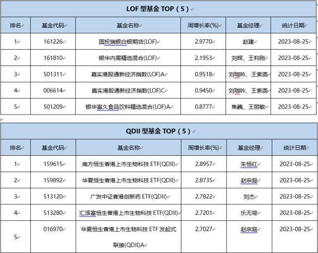 单基金方面,剔除掉创新封基类型基金的影响,上周业绩表现最好的基金为创金合信港股通成长股票A,周涨跌幅为4.1118%,为股票型基金;分基金类型看,同样剔除掉分级杠杆及固定收益两类基金的影响,股票型基金冠军为创金合信港股通成长股票A,周涨跌幅为4.1118%;债券型基金冠军为华商收益增强债券A,周涨跌幅为0.7087%; 混合型基金冠军为前海开源金银珠宝混合C,周涨跌幅为3.7594%; 货币型基金冠军为信达现金宝货币型,周涨跌幅为0.0510%;ETF型基金冠军为建信易盛郑商所能源化工期货ETF,周涨跌幅为3.3232%;LOF型基金冠军为国投瑞银白银期货(LOF),周涨跌幅为2.9770%;QDII基金冠军为南方恒生香港上市生物科技ETF(QDII),周涨跌幅为2.8957%;下面是不同类型基金周涨跌幅TOP5 (剔除掉分级基金的影响)