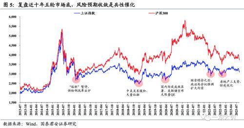 历次印花税下调后非银和弹性板块领涨。1)非银:直接受益市场情绪回暖。2008年之前上市券商数量较少指数失真,2008年4、9月的2次印花税调整后,非银涨幅均居首位,最受益政策刺激下市场情绪的快速回升。2)高弹性行业:2008年之前周期行业受资金关注是弹性板块,易受短期情绪带动。四次印花税下调后,顺周期行业涨幅普遍居前,国内经济驱动以大规模要素投入为主,周期行业具有成长性且受投资者关注,因此具备较强股价弹性,利好政策发布后易成为资金追捧对象。3)复盘近十年五轮市场底,风险预期收敛、风险偏好提振是共性催化。前期跌幅大、估值分位低、预期修复快的板块领涨。