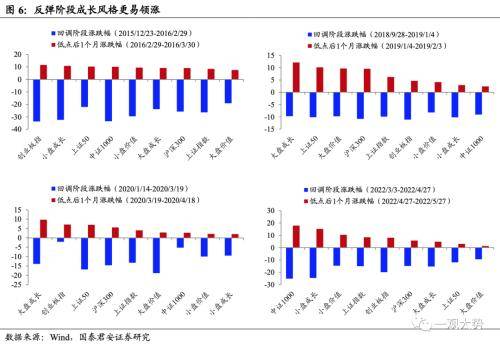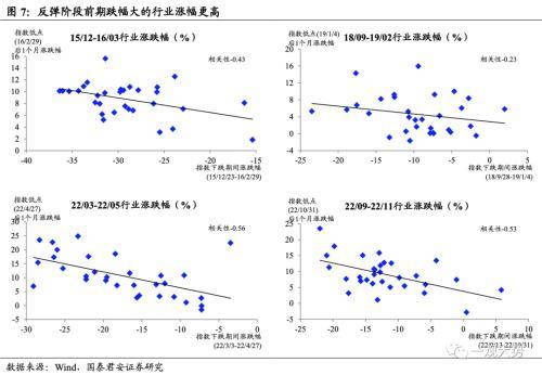以史为鉴,底部反弹领涨行业:前期跌幅大、估值分位低、预期修复快。复盘历史上典型底部反弹行情(2016/2/29、2019/1/4、2020/3/19、2022/4/27、2022/10/31),指数低点后1个月领涨风格和行业,具有几点特征:①反弹阶段成长风格更易领涨。除2022年10月地产和防疫政策松绑直接利好价值风格外,其余四轮反弹行情中成长风格均占优。②前期跌幅大的行业,反弹弹性更强。除2020年3月外,其余4次各行业在指数调整阶段和反弹阶段涨跌幅具有明显相关性,即前期跌幅越大,反弹阶段弹性越强。③估值低位提供更高胜率。除2016年2月外,其余4次反弹阶段,领涨行业在指数低点的估值分位普遍降至20%以下,低估值提供更高的胜率。④反弹阶段领涨行业易出现在“预期快速修复”的领域。除上述交易因素外,反弹领涨行业普遍还具有预期快速扭转的催化,典型如2022年4月悲观情绪出清后,供应链受到影响的汽车、机械产业链领涨;2022年10月地产三支箭、防疫优化政策推出后,地产链、大消费预期快速扭转,涨幅领先。
