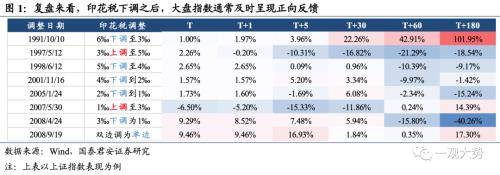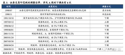 时隔十五年,证券交易印花税调降。自1990年7月开征印花税至今,我国A股证券交易印花税税率共经历过多次调整,其中6次下调综合税率,分别是:1)1991年10月10日,由6‰下调至3‰;2)1998年6月12日,由5‰下调到4‰;3)2001年11月16日,由4‰下调到2‰;4)2005年1月23日,由2‰下调到1‰;5)2008年4月24日,由3‰调整为1‰;6)2008年9月19日,证券交易印花税由双边征收改为单边征收,税率保持1‰。