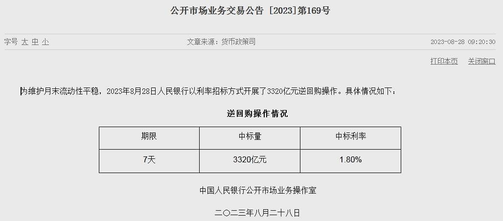 中新经纬8月28日电 央行网站28日公告,为维护月末流动性平稳,8月28日人民银行以利率招标方式开展了3320亿元逆回购操作,中标利率1.80%。